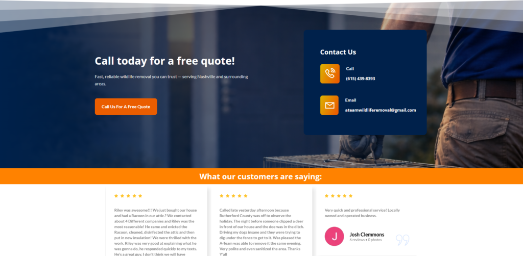 A-Team Wildlife Removal is a Middle Tennessee wildlife control company specializing in humane animal removal, exclusion, and damage repair. Their goal was to improve their online presence, rank in multiple service areas, and generate more qualified calls from homeowners dealing with urgent wildlife issues.