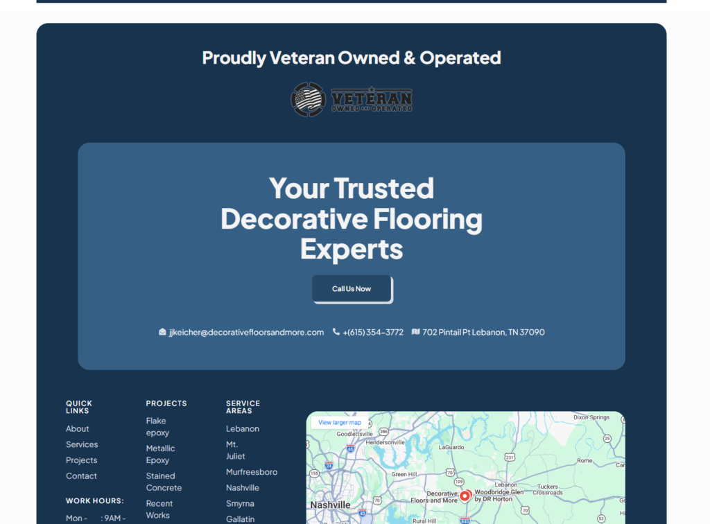 The new website provided Decorative Floors and More with a modern, professional online presence that better reflects the quality of their work. Visitors can now quickly understand the services offered, view project photos, and request quotes through a clear and easy-to-navigate layout designed to guide users toward taking action.
